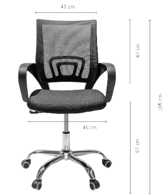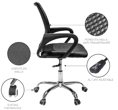 CALIDAD: Silla forrada en malla antitranspirante, asiento acolchado, base metálica y ruedas de goma.